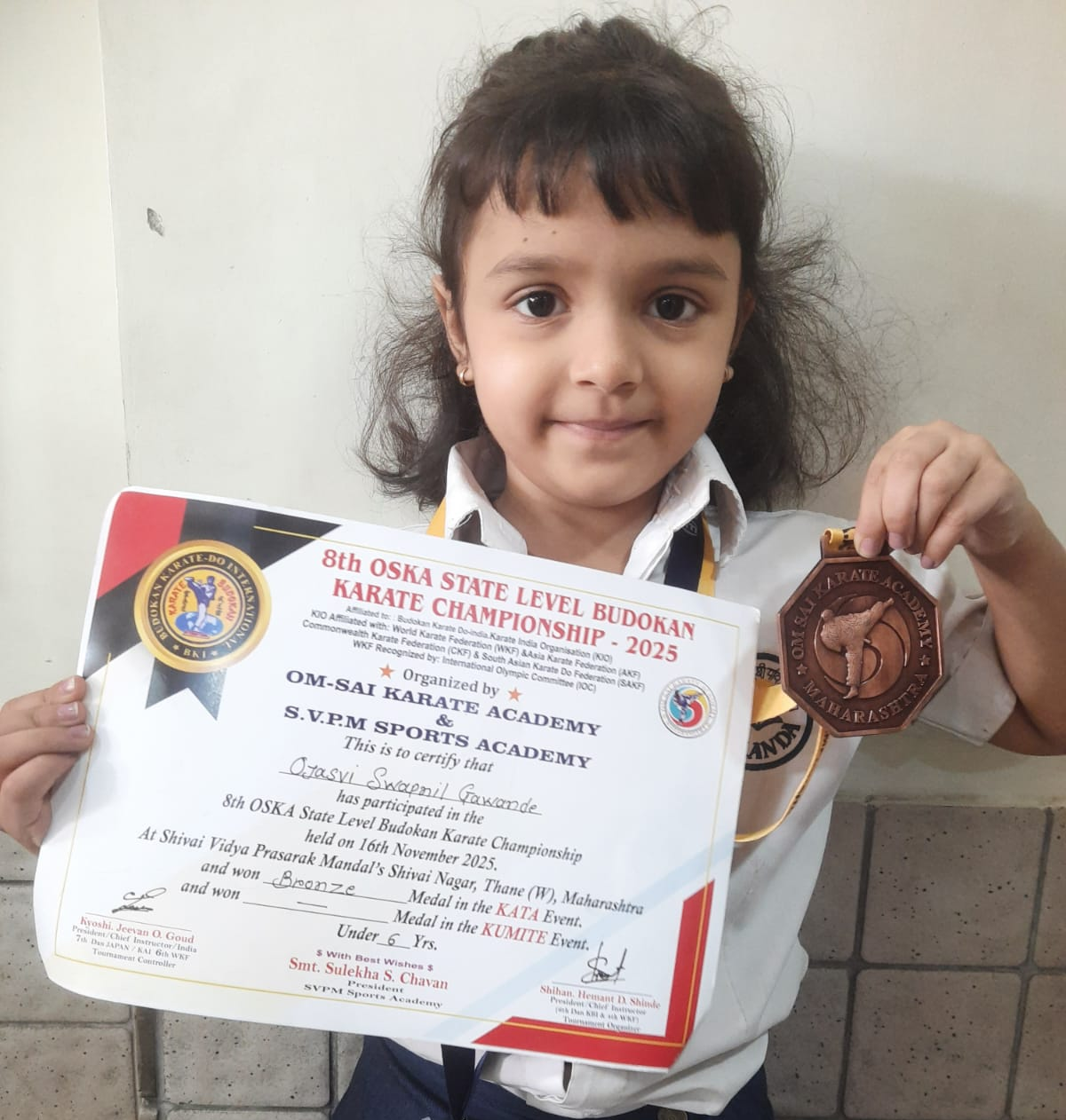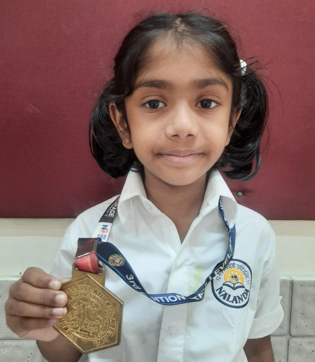 Ayra Yadav from Std. 1A secured 1st Place (Gold Medal) at the State Level Athletic Meet 2025 held in Nashik, organized by the Nashik Athletics Foundation.